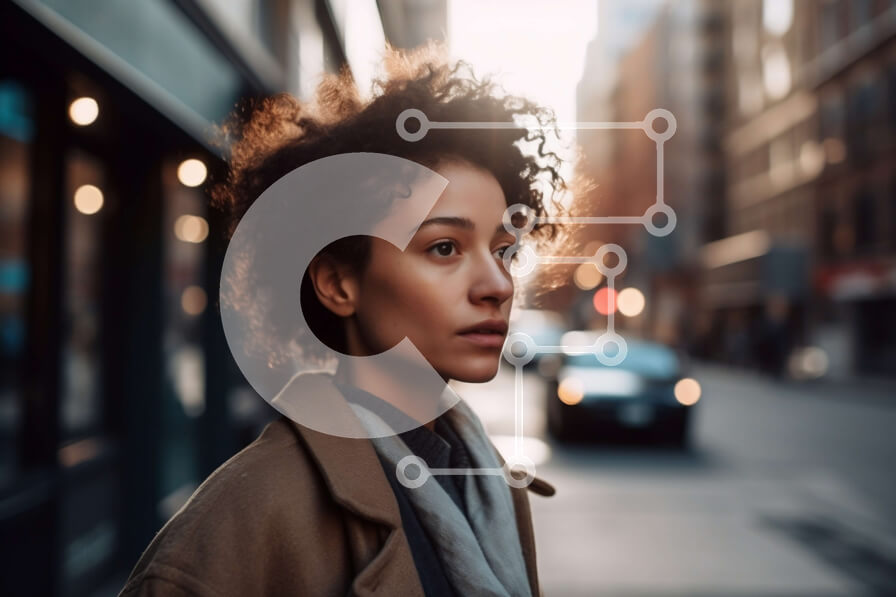 Intra Συλλεκτικό Ξύλινο Παζλ Plywood 4mm - Κομψή γυναίκα που στέκεται σε έναν πολυσύχναστο δρόμο με ψηλά κτίρια στο βάθος Σε Ξύλινο Κουτί - Διαστάσεις Puzzle: 10x10 cm – 25 κομμάτια