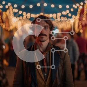 Intra Συλλεκτικό Ξύλινο Παζλ Plywood 4mm - Σοβαρός άνδρας με μουστάκι που στέκεται μπροστά από τη σκηνή με φώτα χορδών Σε Ξύλινο Κουτί - Διαστάσεις Puzzle: 10x10 cm – 25 κομμάτια