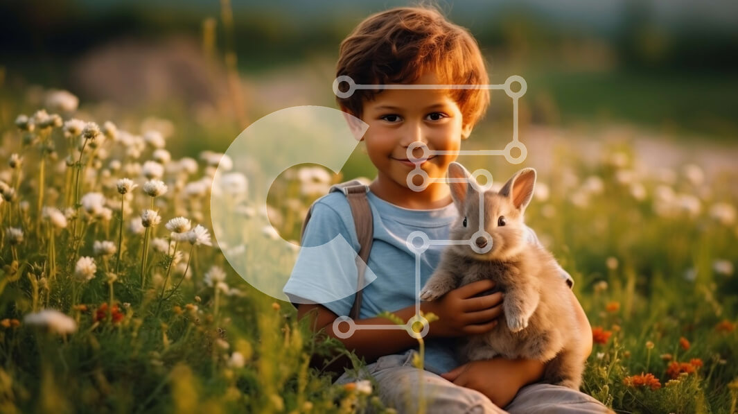 Intra Συλλεκτικό Ξύλινο Παζλ Plywood 4mm - Αξιολάτρευτη εικόνα του νεαρού αγοριού που κρατά ένα κουνέλι σε ένα χωράφι με αγριολούλουδα Σε Ξύλινο Κουτί - Διαστάσεις Puzzle: 10x10 cm – 25 κομμάτια