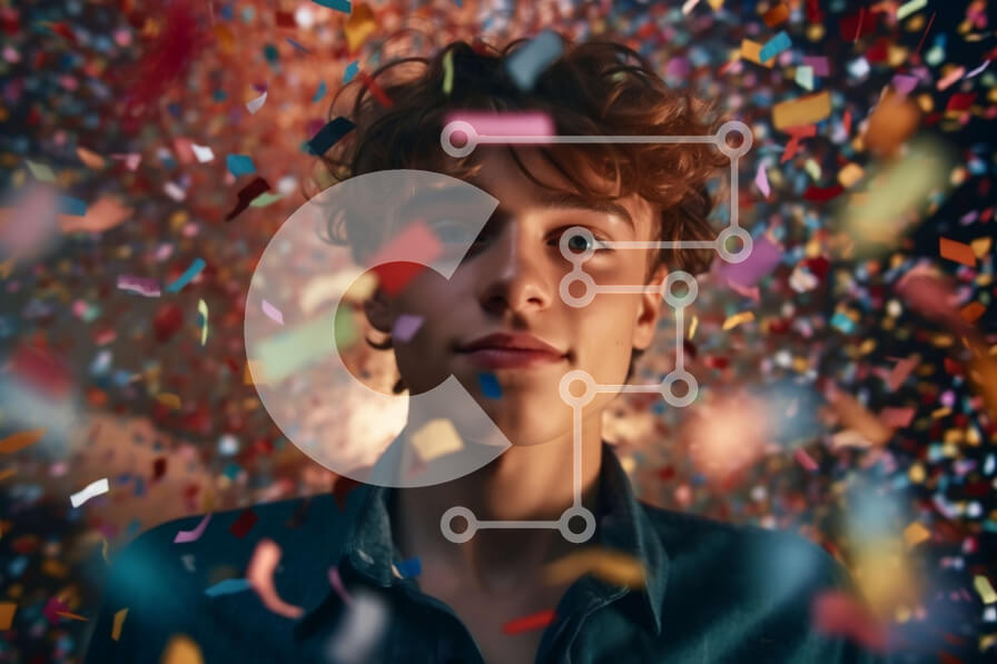 Intra Συλλεκτικό Ξύλινο Παζλ Plywood 4mm - Σοβαρός νεαρός άνδρας με μπλε πουκάμισο που περιβάλλεται από πολύχρωμα κομφετί Σε Ξύλινο Κουτί - Διαστάσεις Puzzle: 10x10 cm – 25 κομμάτια