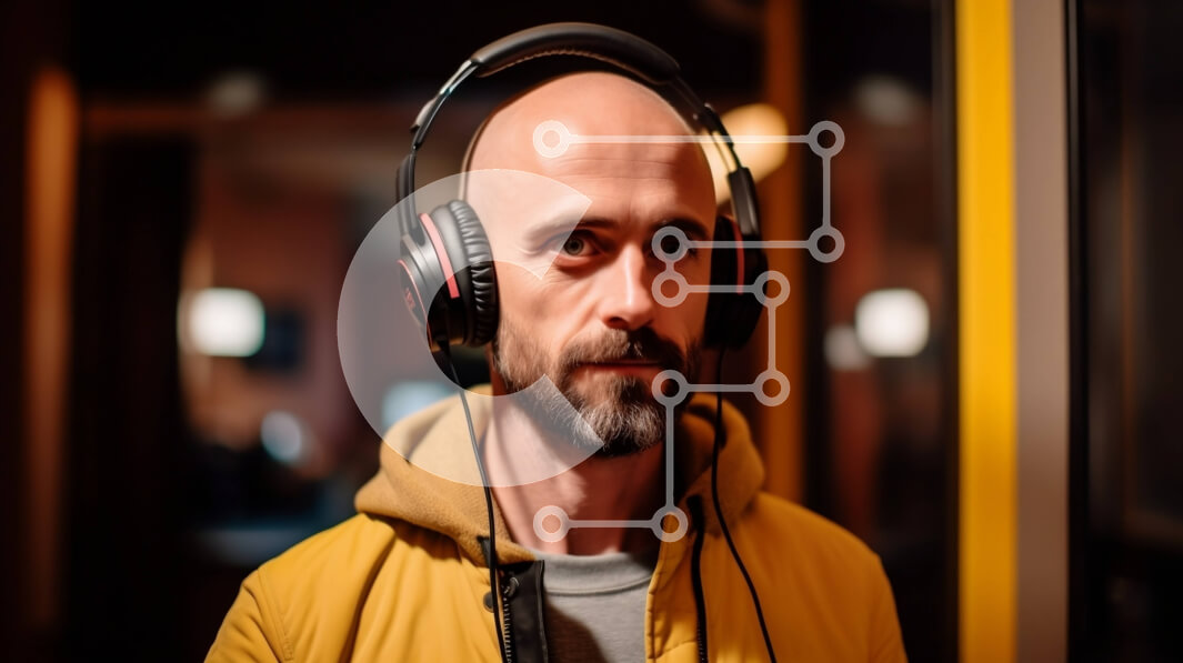 Intra Συλλεκτικό Ξύλινο Παζλ Plywood 4mm - Σοβαρός φαλακρός άνδρας με κίτρινο σακάκι και ακουστικά που κοιτάζει την κάμερα Σε Ξύλινο Κουτί - Διαστάσεις Puzzle: 10x10 cm – 25 κομμάτια