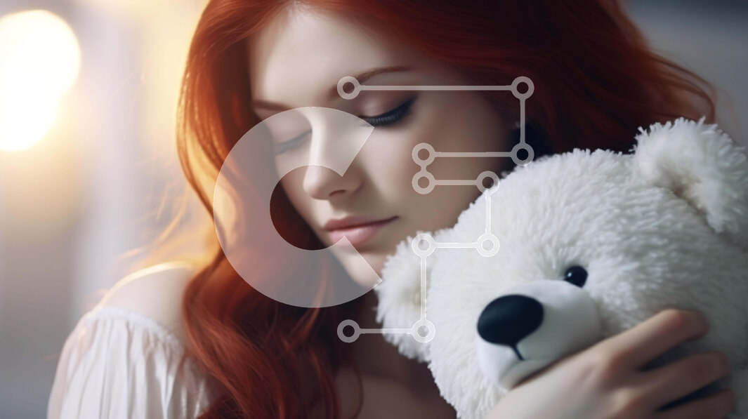 Intra Συλλεκτικό Ξύλινο Παζλ Plywood 4mm - Στοργική νεαρή γυναίκα με κόκκινα μαλλιά που αγκαλιάζει το μεγάλο λευκό αρκουδάκι Σε Ξύλινο Κουτί - Διαστάσεις Puzzle: 10x10 cm – 25 κομμάτια