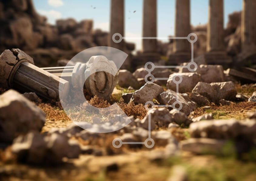 Intra Συλλεκτικό Ξύλινο Παζλ Plywood 4mm - Ιστορικά Απομεινάρια: Σωρός από μπάζα και πυλώνες Σε Ξύλινο Κουτί - Διαστάσεις Puzzle: 10x10 cm – 25 κομμάτια