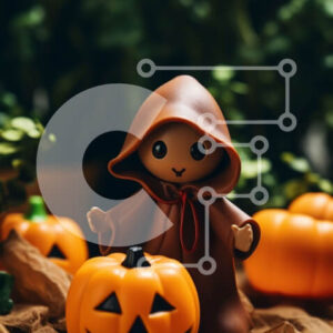 Intra Συλλεκτικό Ξύλινο Παζλ Plywood 4mm - Πορτοκαλί φιγούρα με κουκούλα που κάθεται σε κολοκύθες Σε Ξύλινο Κουτί - Διαστάσεις Puzzle: 10x10 cm – 25 κομμάτια