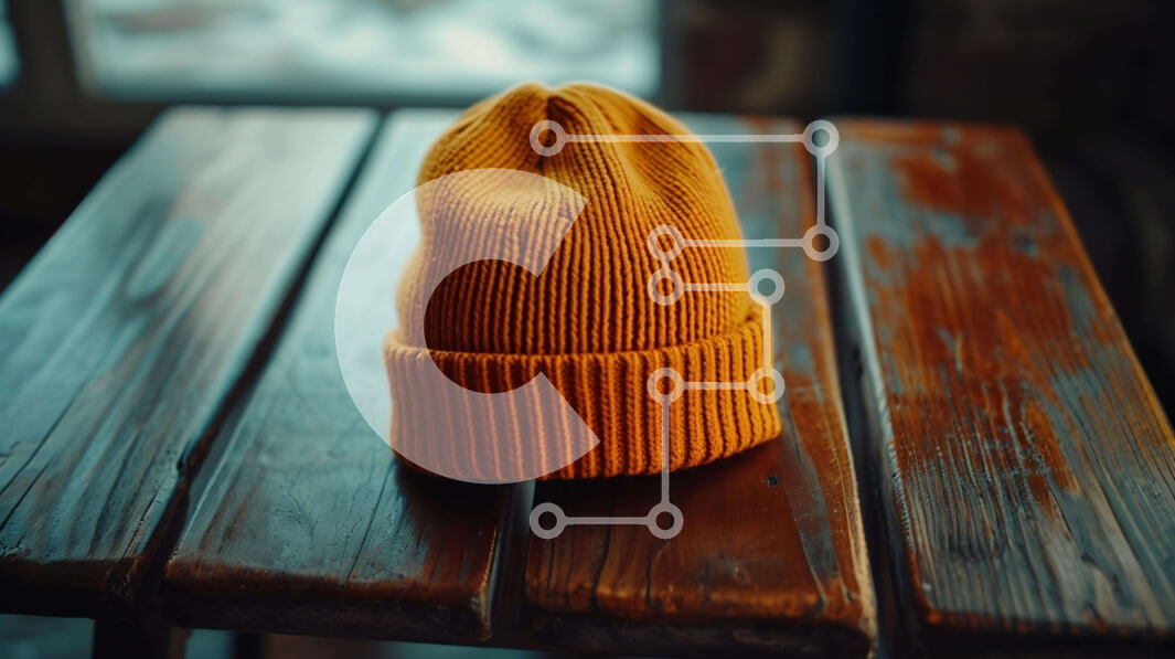Intra Συλλεκτικό Ξύλινο Παζλ Plywood 4mm - Πορτοκαλί πλεκτό Beanie σε ξύλινο τραπέζι με χιονισμένο τοπίο Σε Ξύλινο Κουτί - Διαστάσεις Puzzle: 10x10 cm – 25 κομμάτια
