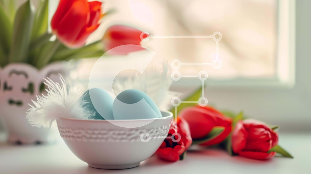 Intra Συλλεκτικό Ξύλινο Παζλ Plywood 4mm - Στολισμός τραπεζιού με θέμα το Πάσχα με μπλε αυγά και κόκκινες τουλίπες Σε Ξύλινο Κουτί - Διαστάσεις Puzzle: 10x10 cm – 25 κομμάτια