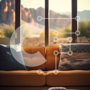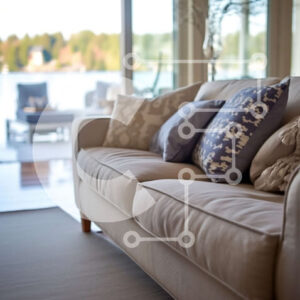 Intra Συλλεκτικό Ξύλινο Παζλ Plywood 4mm - Άνετο σαλόνι με μπεζ καναπέ και θέα στο νερό Σε Ξύλινο Κουτί - Διαστάσεις Puzzle: 10x10 cm – 25 κομμάτια