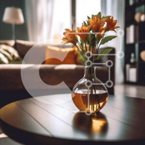 Intra Συλλεκτικό Ξύλινο Παζλ Plywood 4mm - Άνετο σαλόνι με πορτοκαλί τουλίπες σε ξύλινο τραπέζι Σε Ξύλινο Κουτί - Διαστάσεις Puzzle: 10x10 cm – 25 κομμάτια