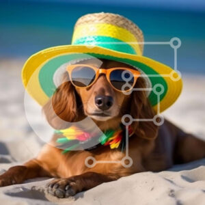 Intra Συλλεκτικό Ξύλινο Παζλ Plywood 4mm - Καφέ σκυλί με πολύχρωμο καπέλο και γυαλιά ηλίου στην παραλία Σε Ξύλινο Κουτί - Διαστάσεις Puzzle: 10x10 cm – 25 κομμάτια
