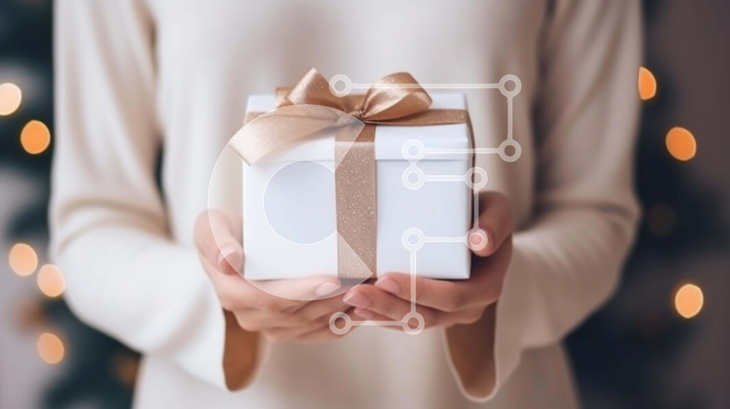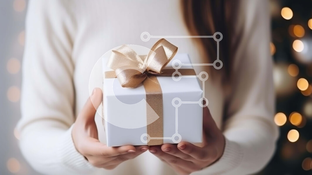 Intra Συλλεκτικό Ξύλινο Παζλ Plywood 4mm - Γυναίκα που κρατά ένα κουτί δώρου με χριστουγεννιάτικα φώτα στο φόντο Σε Ξύλινο Κουτί - Διαστάσεις: 10x10 cm – 25 κομμάτια
