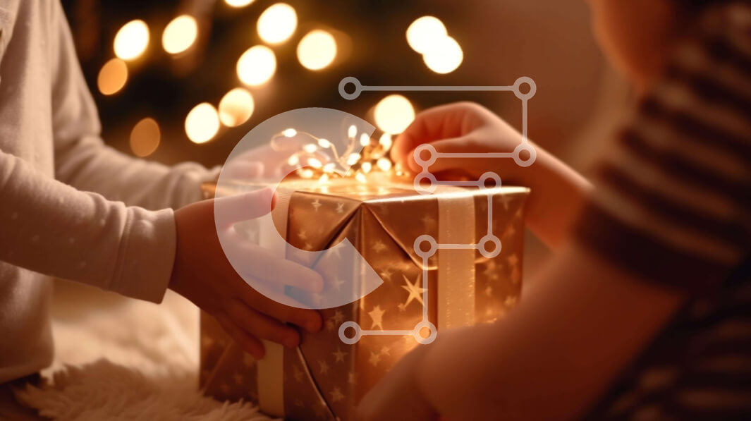 Intra Συλλεκτικό Ξύλινο Παζλ Plywood 4mm - Δύο παιδιά που κρατούν ένα χρυσό κουτί δώρου με χριστουγεννιάτικα στολίδια Σε Ξύλινο Κουτί - Διαστάσεις: 10x10 cm – 25 κομμάτια