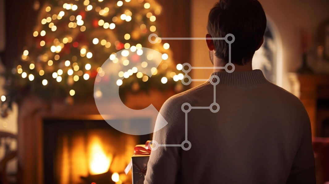 Intra Συλλεκτικό Ξύλινο Παζλ Plywood 4mm - Άνδρας μπροστά από το τζάκι με ανοιχτό δώρο και χριστουγεννιάτικο δέντρο Σε Ξύλινο Κουτί - Διαστάσεις: 10x10 cm – 25 κομμάτια