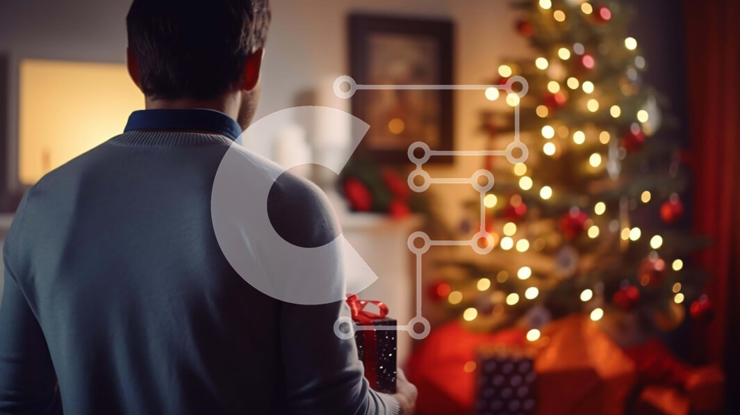 Intra Συλλεκτικό Ξύλινο Παζλ Plywood 4mm - Άνδρας με πράσινο και κόκκινο ντύσιμο ποζάρει με χριστουγεννιάτικο δέντρο Σε Ξύλινο Κουτί - Διαστάσεις: 10x10 cm – 25 κομμάτια
