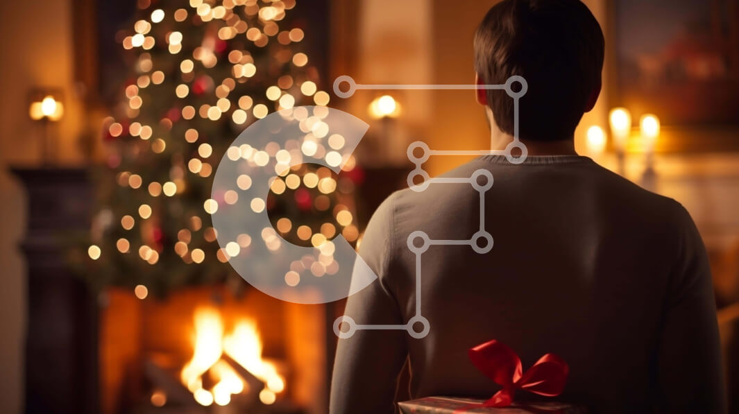Intra Συλλεκτικό Ξύλινο Παζλ Plywood 4mm - Άνδρας που απολαμβάνει την περίοδο των Χριστουγέννων με ανοιχτό δώρο μπροστά από το τζάκι Σε Ξύλινο Κουτί - Διαστάσεις: 10x10 cm – 25 κομμάτια