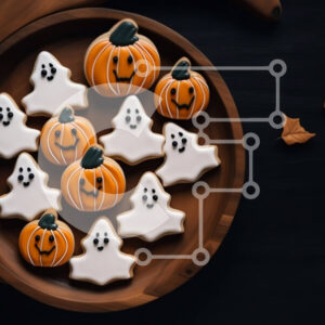 Intra Συλλεκτικό Ξύλινο Παζλ Plywood 4mm - Αποκριάτικα μπισκότα διακοσμημένα ως φαντάσματα και κολοκύθες Σε Ξύλινο Κουτί - Διαστάσεις: 10x10 cm – 25 κομμάτια