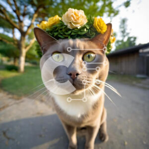 Intra Συλλεκτικό Ξύλινο Παζλ Plywood 4mm - Γκρίζα γάτα που φορά λουλούδια στο κεφάλι της στη μέση του δρόμου Σε Ξύλινο Κουτί - Διαστάσεις: 10x10 cm – 25 κομμάτια