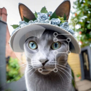 Intra Συλλεκτικό Ξύλινο Παζλ Plywood 4mm - Γκρίζα γάτα που φορά λουλουδάτο λευκό καπέλο με μπλε μάτια Σε Ξύλινο Κουτί - Διαστάσεις: 10x10 cm – 25 κομμάτια
