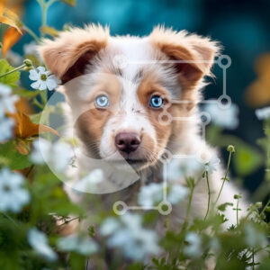 Intra Συλλεκτικό Ξύλινο Παζλ Plywood 4mm - Ευτυχισμένος σκύλος με μπλε μάτια που κάθεται ανάμεσα σε λουλούδια σε έναν κήπο Σε Ξύλινο Κουτί - Διαστάσεις: 10x10 cm – 25 κομμάτια