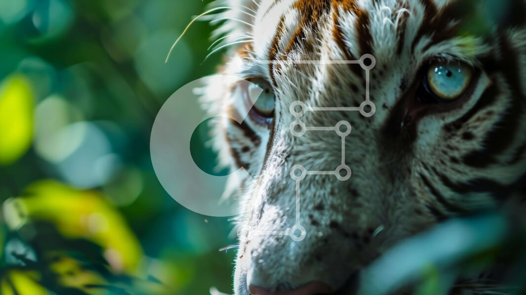 Intra Συλλεκτικό Ξύλινο Παζλ Plywood 4mm - Κοντινό πλάνο μιας λευκής τίγρης με μπλε μάτια σε πράσινο φύλλωμα Σε Ξύλινο Κουτί - Διαστάσεις: 10x10 cm – 25 κομμάτια