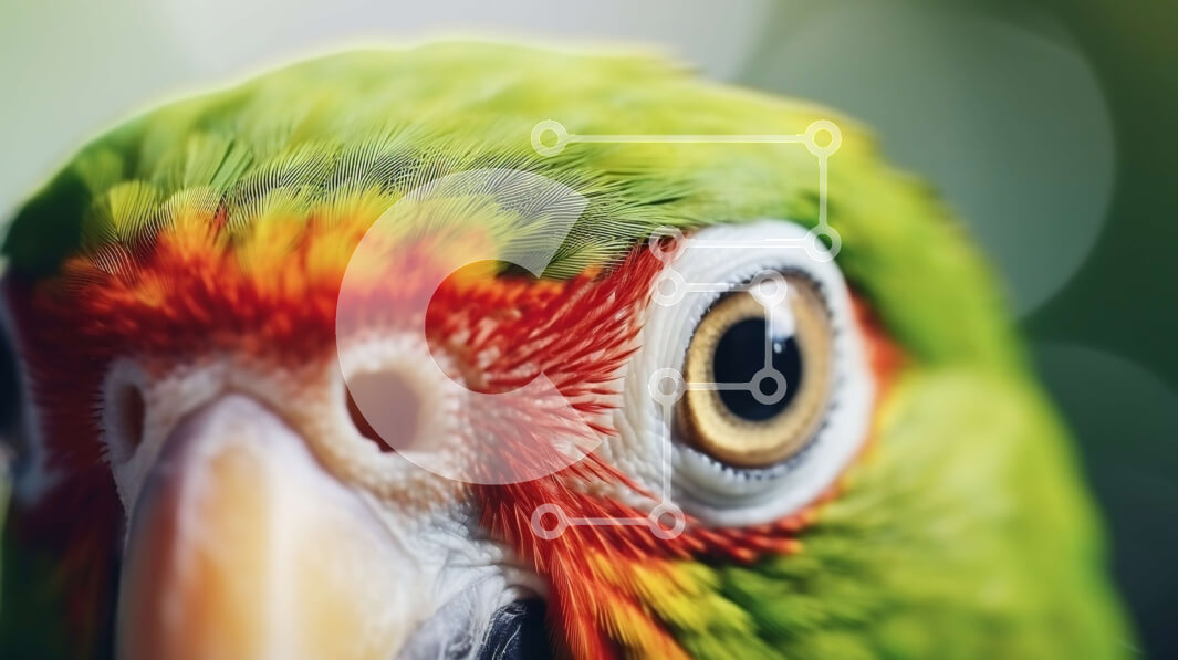 Intra Συλλεκτικό Ξύλινο Παζλ Plywood 4mm - Κοντινό πλάνο του κεφαλιού και του προσώπου του πράσινου παπαγάλου Σε Ξύλινο Κουτί - Διαστάσεις: 10x10 cm – 25 κομμάτια