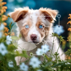 Intra Συλλεκτικό Ξύλινο Παζλ Plywood 4mm - Αξιολάτρευτο καφέ και λευκό κουτάβι με μπλε μάτια ανάμεσα σε λουλούδια Σε Ξύλινο Κουτί - Διαστάσεις: 10x10 cm – 25 κομμάτια