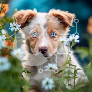 Intra Συλλεκτικό Ξύλινο Παζλ Plywood 4mm - Αξιολάτρευτο κουτάβι που κάθεται σε έναν κήπο με μπλε και λευκά λουλούδια Σε Ξύλινο Κουτί - Διαστάσεις: 10x10 cm – 25 κομμάτια