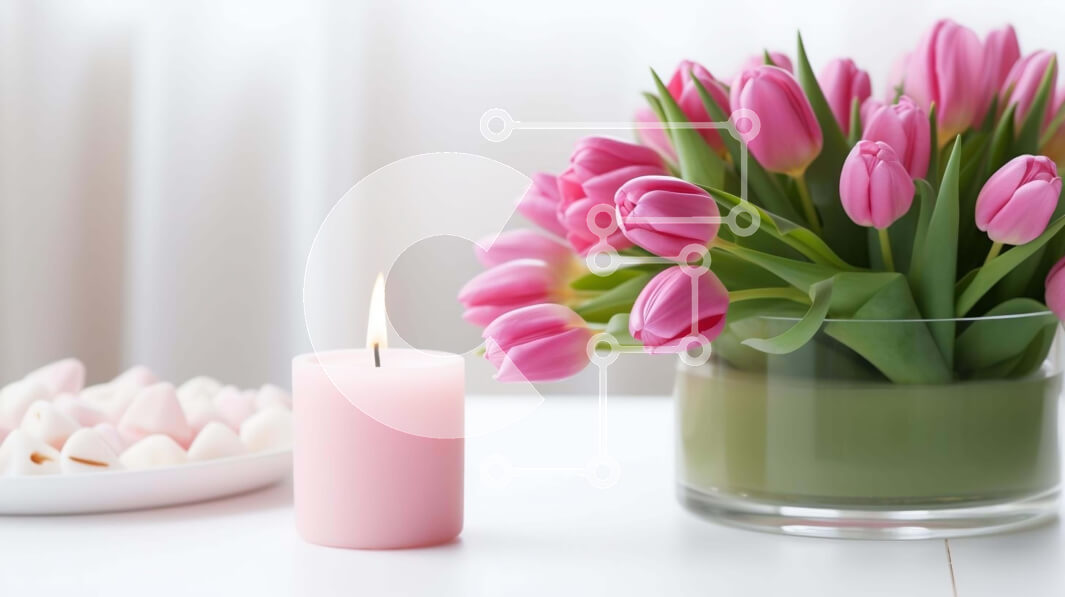 Intra Συλλεκτικό Ξύλινο Παζλ Plywood 4mm - Ροζ τουλίπες σε γυάλινο βάζο με λευκά marshmallows και κερί Σε Ξύλινο Κουτί - Διαστάσεις: 10x10 cm – 25 κομμάτια