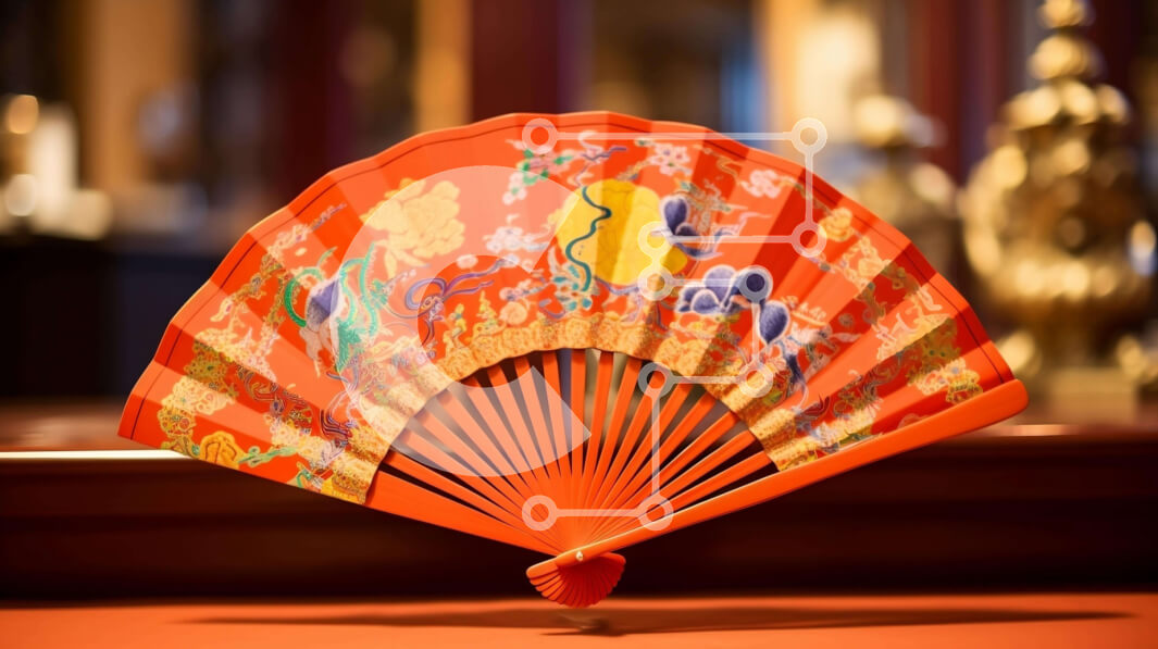 Intra Συλλεκτικό Ξύλινο Παζλ Plywood 4mm - Πορτοκαλί βεντάλια σε κόκκινο επιτραπέζιο με διακοσμητικά σχέδια Σε Ξύλινο Κουτί - Διαστάσεις: 10x10 cm – 25 κομμάτια