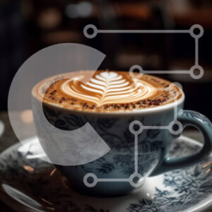 Intra Συλλεκτικό Ξύλινο Παζλ Plywood 4mm - Αφρώδης καπουτσίνο σε μπλε και άσπρο κεραμικό κύπελλο με σχέδιο φύλλων σε ξύλινο τραπέζι μπροστά από τη θέα της πόλης τη νύχτα Σε Ξύλινο Κουτί - Διαστάσεις: 10x10 cm – 25 κομμάτια