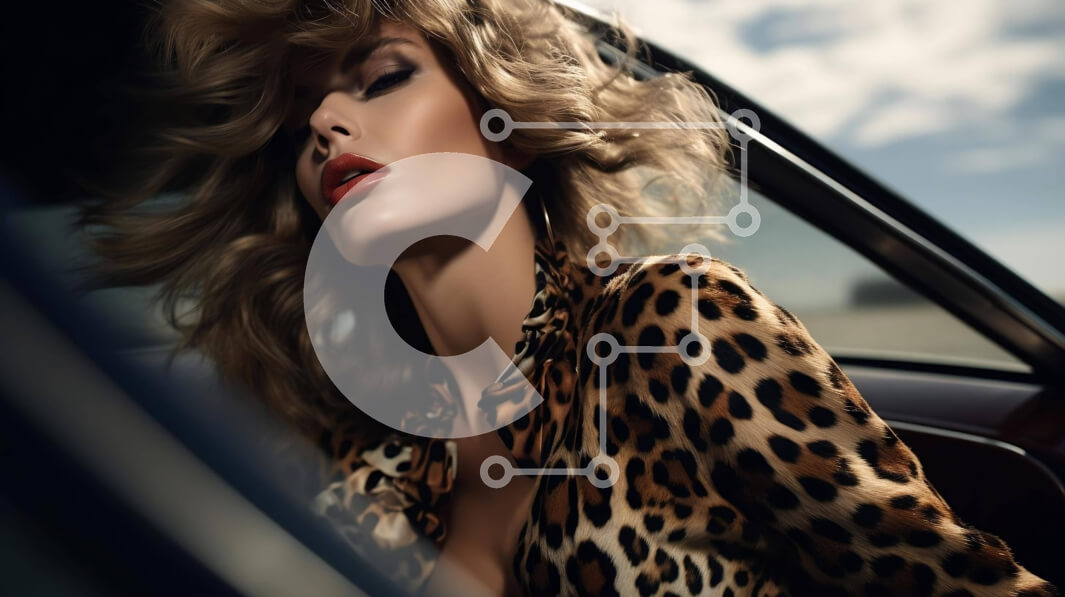 Intra Συλλεκτικό Ξύλινο Παζλ Plywood 4mm - Κομψή γυναίκα με φόρεμα Animal Print που γέρνει έξω από το παράθυρο του αυτοκινήτου Σε Ξύλινο Κουτί - Διαστάσεις Puzzle: 10x10 cm – 25 κομμάτια