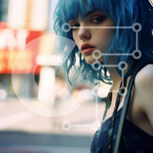 Intra Συλλεκτικό Ξύλινο Παζλ Plywood 4mm - Νεαρή γυναίκα με μπλε μαλλιά σε αστικό περιβάλλον Σε Ξύλινο Κουτί - Διαστάσεις Puzzle: 10x10 cm – 25 κομμάτια