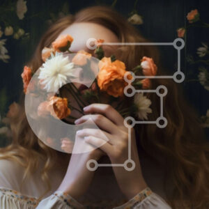 Intra Συλλεκτικό Ξύλινο Παζλ Plywood 4mm - Όμορφη γυναίκα με μπουκέτο λουλούδια μπροστά από τον floral τοίχο Σε Ξύλινο Κουτί - Διαστάσεις Puzzle: 10x10 cm – 25 κομμάτια