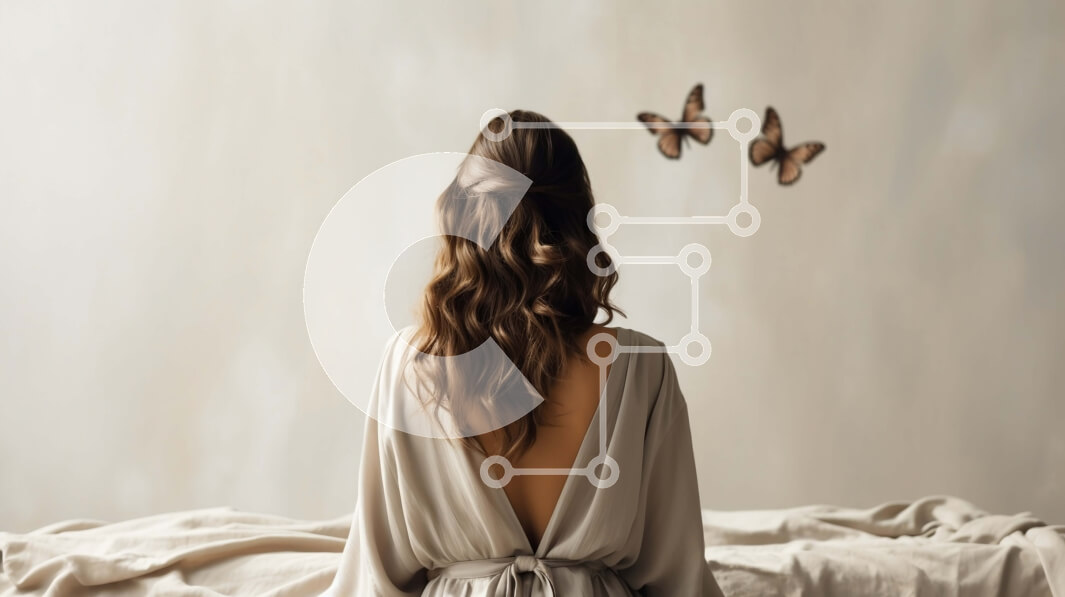 Intra Συλλεκτικό Ξύλινο Παζλ Plywood 4mm - Γυναίκα με λευκό φόρεμα κάθεται σε ένα κρεβάτι με πεταλούδες Σε Ξύλινο Κουτί - Διαστάσεις Puzzle: 10x10 cm – 25 κομμάτια