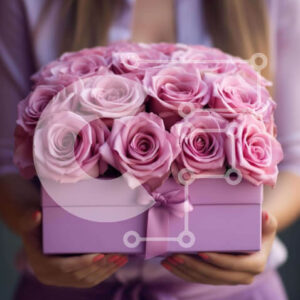 Intra Συλλεκτικό Ξύλινο Παζλ Plywood 4mm - Γυναίκα που κρατά ένα μωβ κουτί λουλουδιών με ροζ τριαντάφυλλα και κορδέλα Σε Ξύλινο Κουτί - Διαστάσεις Puzzle: 10x10 cm – 25 κομμάτια