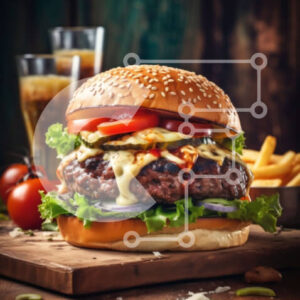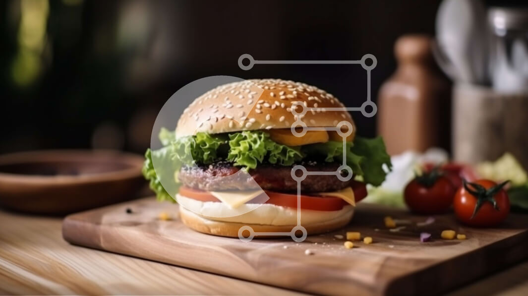 Intra Συλλεκτικό Ξύλινο Παζλ Plywood 4mm - Γλυκιά εικόνα του χάμπουργκερ με τυρί, μαρούλι και ντομάτα σε ξύλινο ξύλο κοπής Σε Ξύλινο Κουτί - Διαστάσεις: 10x10 cm – 25 κομμάτια