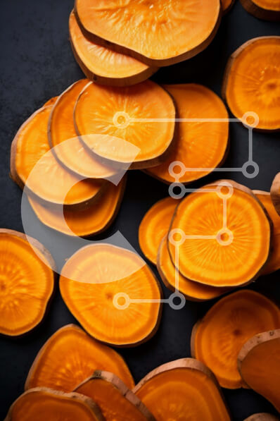 Intra Συλλεκτικό Ξύλινο Παζλ Plywood 4mm - Διάφορες φέτες γλυκοπατάτας και καρότων σε σκούρο φόντο Σε Ξύλινο Κουτί - Διαστάσεις: 10x10 cm – 25 κομμάτια