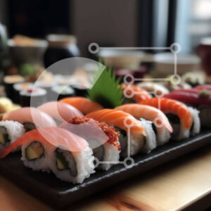 Intra Συλλεκτικό Ξύλινο Παζλ Plywood 4mm - Διάφοροι τύποι σούσι σε μαύρο δίσκο με σάλτσα σόγιας και Wasabi στο πλάι Σε Ξύλινο Κουτί - Διαστάσεις: 10x10 cm – 25 κομμάτια
