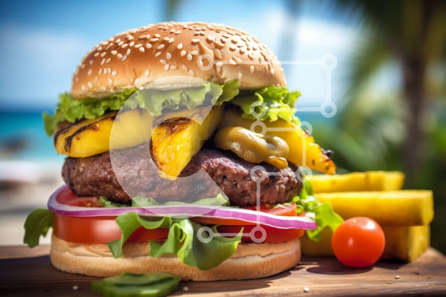 Intra Συλλεκτικό Ξύλινο Παζλ Plywood 4mm - Ζουμερό χάμπουργκερ με ανανά, κρεμμύδια και ντομάτες σε ένα ξύλινο τραπέζι Σε Ξύλινο Κουτί - Διαστάσεις: 10x10 cm – 25 κομμάτια