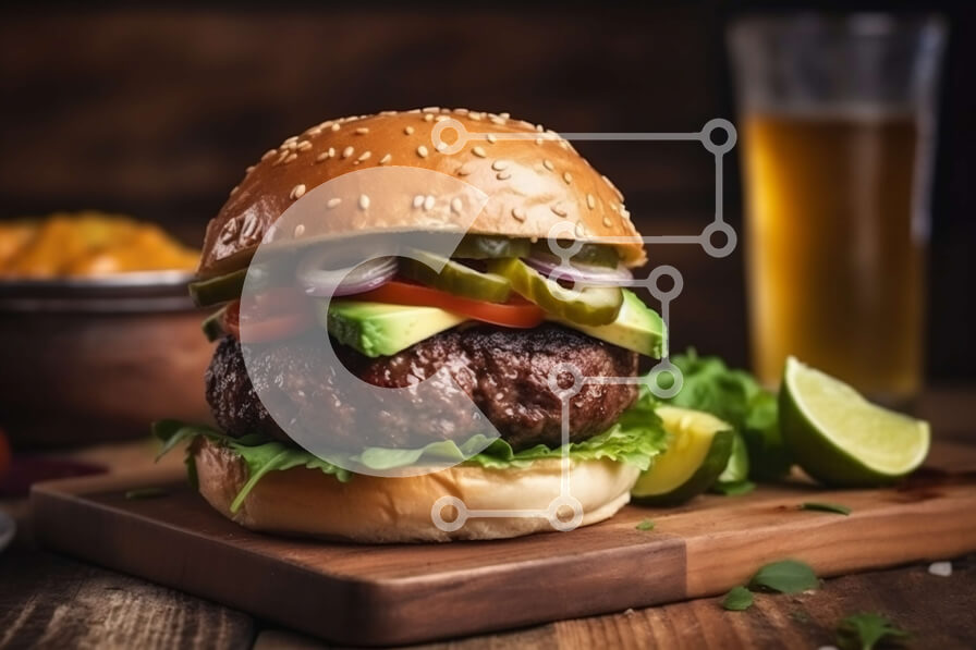 Intra Συλλεκτικό Ξύλινο Παζλ Plywood 4mm - Ζουμερό μοσχαρίσιο μπιφτέκι με αβοκάντο, μαρούλι και ντομάτα σε ξύλινη σανίδα - Φωτογραφία Αρχείου Σε Ξύλινο Κουτί - Διαστάσεις: 10x10 cm – 25 κομμάτια