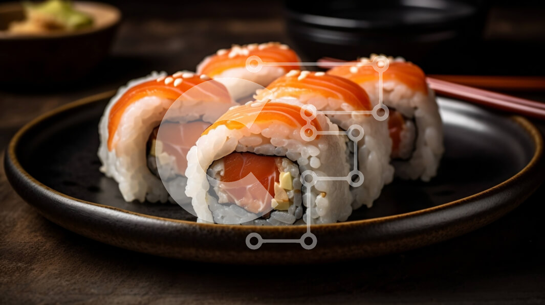 Intra Συλλεκτικό Ξύλινο Παζλ Plywood 4mm - Καταπληκτική εικόνα με ρολά σούσι σολομού και αβοκάντο σε μαύρο πιάτο Σε Ξύλινο Κουτί - Διαστάσεις: 10x10 cm – 25 κομμάτια