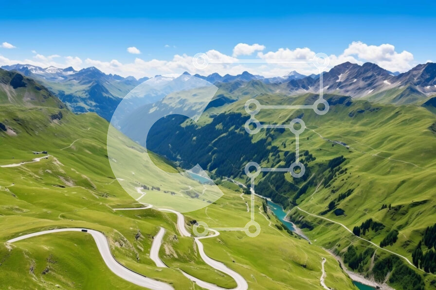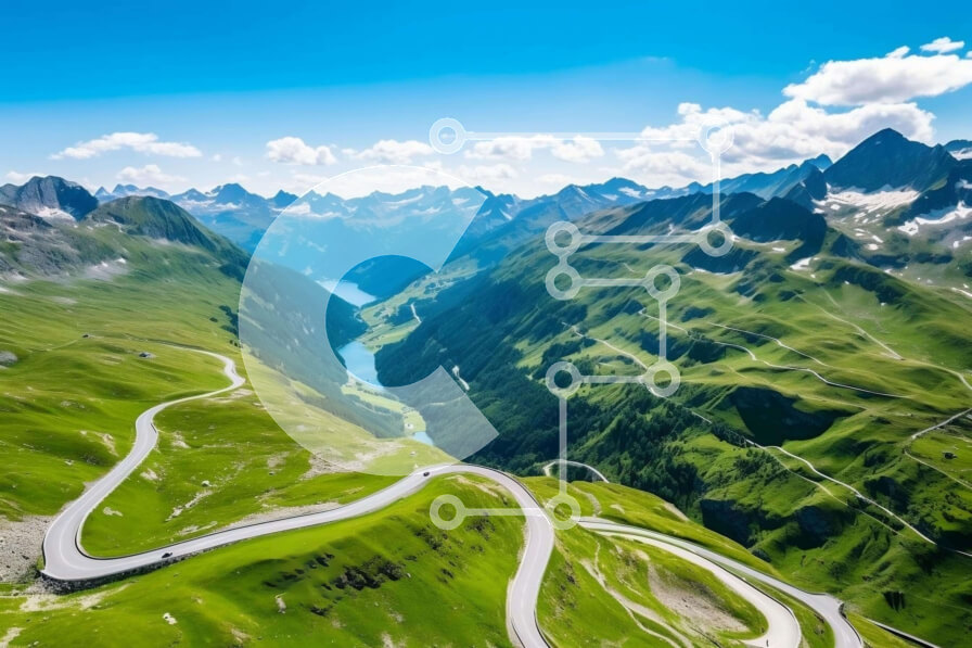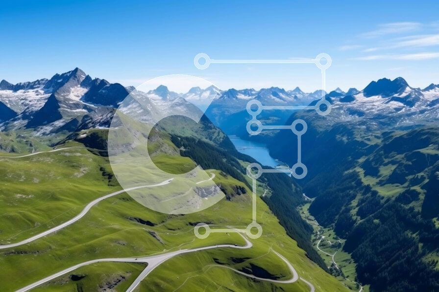 Intra Συλλεκτικό Ξύλινο Παζλ Plywood 4mm - Εναέρια άποψη του ελικοειδή ορεινού δρόμου στις ελβετικές Άλπεις με τη λίμνη Σε Ξύλινο Κουτί - Διαστάσεις: 10x10 cm – 25 κομμάτια