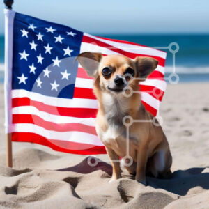 Intra Συλλεκτικό Ξύλινο Παζλ Plywood 4mm - Ευτυχισμένος ασπρόμαυρος σκύλος στην παραλία με την αμερικανική σημαία Σε Ξύλινο Κουτί - Διαστάσεις: 10x10 cm – 25 κομμάτια