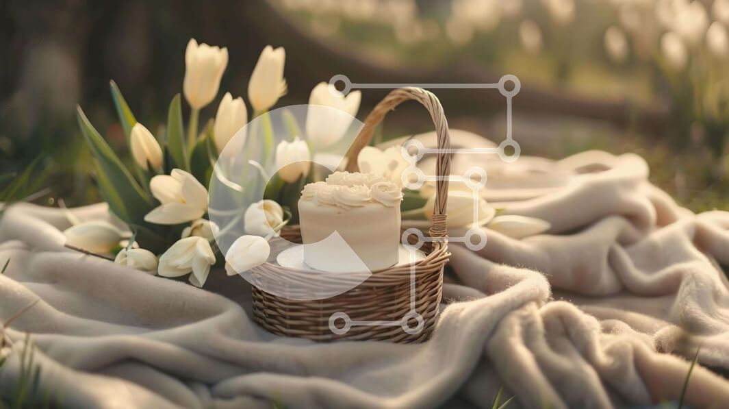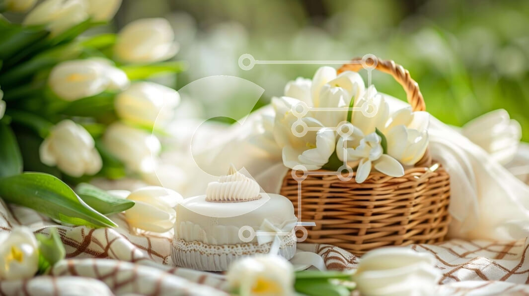 Intra Συλλεκτικό Ξύλινο Παζλ Plywood 4mm - Καλάθι με λευκές τουλίπες και διακοσμημένο κέικ Σε Ξύλινο Κουτί - Διαστάσεις: 10x10 cm – 25 κομμάτια
