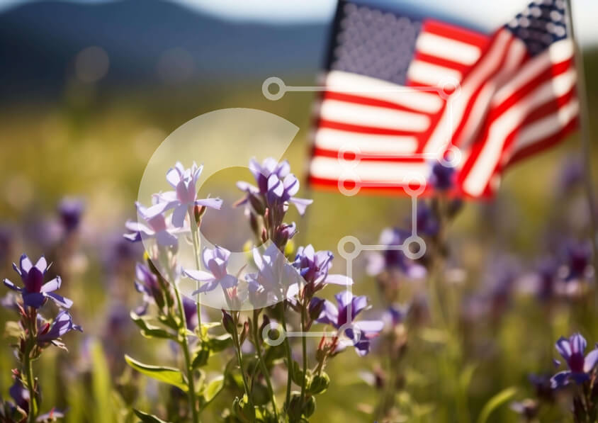 Intra Συλλεκτικό Ξύλινο Παζλ Plywood 4mm - Αμερικανική σημαία σε ένα χωράφι με μοβ λουλούδια με βουνά στο φόντο Σε Ξύλινο Κουτί - Διαστάσεις: 10x10 cm – 25 κομμάτια