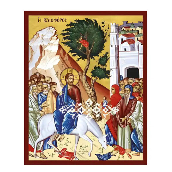 Στην εικόνα βλέπουμε τον Χριστό καθισμένο σε υποζύγιο και τους μαθητές να ακολουθούν με επικεφαλής τον απόστολο Πέτρο.