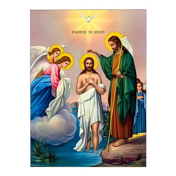 Οι ιεροί ευαγγελιστές μας περιγράφουν το γεγονός της βάπτισης του Ιησού.  Πιο αναλυτικός από τους δύο άλλους ο Ματθαίος αναφέρει: Τότε έρχεται ο Ιησούς από τη Γαλιλαία στον Ιορδάνη, προς τον Ιωάννη, για να βαπτιστεί από αυτόν αλλά ο Ιωάννης τον εμπόδιζε λέγοντάς του “εγώ έχω ανάγκη να βαπτιστώ από εσένα, και εσύ έρχεσαι σε εμένα”;  Ο Ιησούς όμως του απάντησε: ” Ας τα αφήσουμε τώρα αυτά, διότι πρέπει και οι δυο μας να πραγματοποιήσουμε αυτό που προβλέπει το σχέδιο του Θεού”.  Τότε ο Ιωάννης τον άφησε να βαπτιστεί , βαπτίστηκε λοιπόν ο Ιησούς και αμέσως βγήκε από το νερό.  Ξαφνικά άνοιξαν για αυτόν οι ουρανοί και είδε το Πνεύμα του Θεού να κατεβαίνει σαν περιστέρι και να έρχεται επάνω του.  Τότε ακούστηκε μια φωνή από τους ουρανούς που έλεγε ” Αυτός είναι ο Υιός μου ο αγαπητός, αυτός είναι ο εκλεκτός μου”.