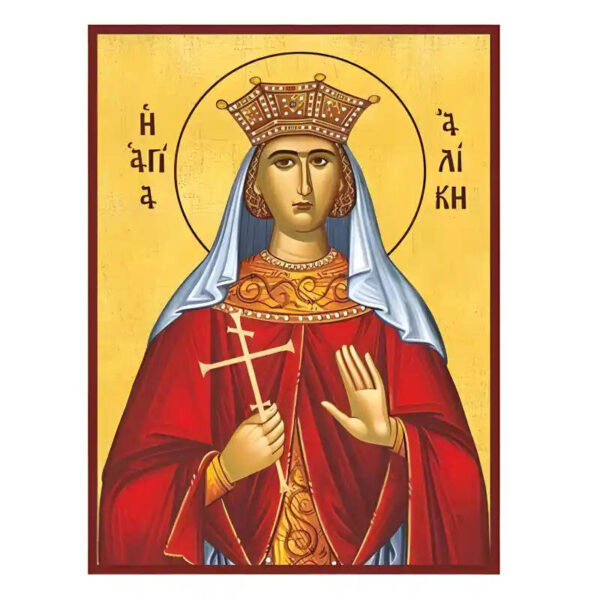 Βασικά Χαρακτηριστικά: – Σχέδιο: Κλασική βυζαντινή εικονογραφία με ζωηρό κόκκινο περίγραμμα – Υλικό: Ξύλο Μασίφ Φλαμουρία υψηλής αντοχής με προστατευτικό βερνίκι για ποιότητα που διαρκεί – Προέλευση: Χειροποίητο στην Ελλάδα – Σκοπός: Ιδανικό για γωνιές προσευχής, εκκλησίες, διακόσμηση σπιτιού ή ως δώρο με νόημα Διαθέσιμα μεγέθη: 10×7 cm (3,9 x 2,8 ίντσες) 15×11 cm (5,9 x 4,3 ίντσες) 21×15 cm (8,3 x 5,9 ίντσες) 26×20 cm (10,2 x 7,9 ίντσες) 40×30 cm (15,8 x 11,8 ίντσες) 45×35 cm (17,7 x 13,8 ίντσες) 50×40 cm (19,7 x 15,8 ίντσες)► Εικόνα της Αγίας Αλίκης ξύλινη. Χειροποίητη ξύλινη εικόνα, ειδικής επεξεργασίας σε σκληρό Φλαμουριά Ξύλο Εικόνα Ορθόδοξης τέχνης, σκαλισμένη ή τυπωμένη σε ξύλο φλαμουριάς υψηλής ποιότητας. Η φυσική απαλότητα και ομοιομορφία του ξύλου τονίζει κάθε λεπτομέρεια του εικονίσματος, αναδεικνύοντας τη βαθιά πνευματικότητα και την ιερότητα της παράδοσης. Ιδανική για οικιακό εικονοστάσι, δώρο βάπτισης, γάμου ή αφιέρωμα σε ναό. Το ξύλο έχει υποστεί ειδική επεξεργασία για αντοχή και αισθητική αρμονία, κρατώντας ζωντανά τα χρώματα και τη μορφή του προσώπου του Αγίου. με ανεξίτηλα χρώματα σε λεπτό καμβά.