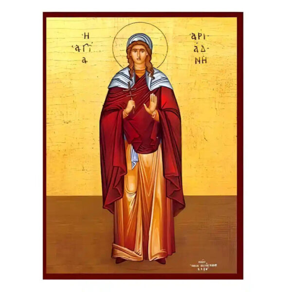 Βασικά Χαρακτηριστικά: – Σχέδιο: Κλασική βυζαντινή εικονογραφία με ζωηρό κόκκινο περίγραμμα – Υλικό: Ξύλο Μασίφ Φλαμουρία υψηλής αντοχής με προστατευτικό βερνίκι για ποιότητα που διαρκεί – Προέλευση: Χειροποίητο στην Ελλάδα – Σκοπός: Ιδανικό για γωνιές προσευχής, εκκλησίες, διακόσμηση σπιτιού ή ως δώρο με νόημα Διαθέσιμα μεγέθη: 10×7 cm (3,9 x 2,8 ίντσες) 15×11 cm (5,9 x 4,3 ίντσες) 21×15 cm (8,3 x 5,9 ίντσες) 26×20 cm (10,2 x 7,9 ίντσες) 40×30 cm (15,8 x 11,8 ίντσες) 45×35 cm (17,7 x 13,8 ίντσες) 50×40 cm (19,7 x 15,8 ίντσες)► Εικόνα της Αγίας Αριάδνης ξύλινη. Χειροποίητη ξύλινη εικόνα, ειδικής επεξεργασίας σε σκληρό Φλαμουριά Ξύλο Εικόνα Ορθόδοξης τέχνης, σκαλισμένη ή τυπωμένη σε ξύλο φλαμουριάς υψηλής ποιότητας. Η φυσική απαλότητα και ομοιομορφία του ξύλου τονίζει κάθε λεπτομέρεια του εικονίσματος, αναδεικνύοντας τη βαθιά πνευματικότητα και την ιερότητα της παράδοσης. Ιδανική για οικιακό εικονοστάσι, δώρο βάπτισης, γάμου ή αφιέρωμα σε ναό. Το ξύλο έχει υποστεί ειδική επεξεργασία για αντοχή και αισθητική αρμονία, κρατώντας ζωντανά τα χρώματα και τη μορφή του προσώπου του Αγίου. με ανεξίτηλα χρώματα σε λεπτό καμβά.