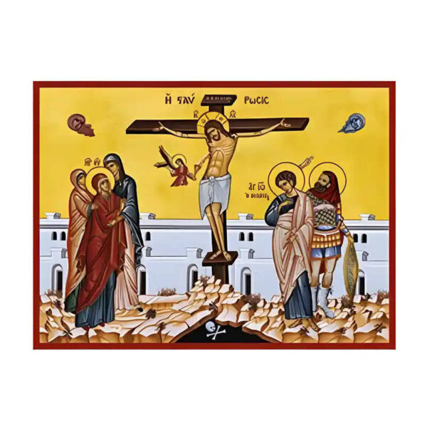 Βασικά Χαρακτηριστικά: – Σχέδιο: Κλασική βυζαντινή εικονογραφία με ζωηρό κόκκινο περίγραμμα – Υλικό: Ξύλο Μασίφ Φλαμουρία υψηλής αντοχής με προστατευτικό βερνίκι για ποιότητα που διαρκεί – Προέλευση: Χειροποίητο στην Ελλάδα – Σκοπός: Ιδανικό για γωνιές προσευχής, εκκλησίες, διακόσμηση σπιτιού ή ως δώρο με νόημα Διαθέσιμα μεγέθη: 10×7 cm (3,9 x 2,8 ίντσες) 15×11 cm (5,9 x 4,3 ίντσες) 21×15 cm (8,3 x 5,9 ίντσες) 26×20 cm (10,2 x 7,9 ίντσες) 40×30 cm (15,8 x 11,8 ίντσες) 45×35 cm (17,7 x 13,8 ίντσες) 50×40 cm (19,7 x 15,8 ίντσες)► Εικόνα της Σταύρωσης του Χριστού ξύλινη. Χειροποίητη ξύλινη εικόνα, ειδικής επεξεργασίας σε σκληρό Φλαμουριά Ξύλο Εικόνα Ορθόδοξης τέχνης, σκαλισμένη ή τυπωμένη σε ξύλο φλαμουριάς υψηλής ποιότητας. Η φυσική απαλότητα και ομοιομορφία του ξύλου τονίζει κάθε λεπτομέρεια του εικονίσματος, αναδεικνύοντας τη βαθιά πνευματικότητα και την ιερότητα της παράδοσης. Ιδανική για οικιακό εικονοστάσι, δώρο βάπτισης, γάμου ή αφιέρωμα σε ναό. Το ξύλο έχει υποστεί ειδική επεξεργασία για αντοχή και αισθητική αρμονία, κρατώντας ζωντανά τα χρώματα και τη μορφή του προσώπου του Αγίου. με ανεξίτηλα χρώματα σε λεπτό καμβά.