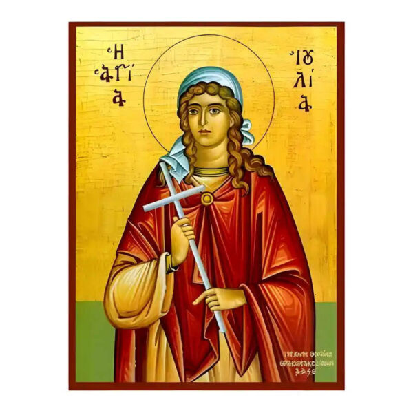 Βασικά Χαρακτηριστικά: – Σχέδιο: Κλασική βυζαντινή εικονογραφία με ζωηρό κόκκινο περίγραμμα – Υλικό: Ξύλο Μασίφ Φλαμουρία υψηλής αντοχής με προστατευτικό βερνίκι για ποιότητα που διαρκεί – Προέλευση: Χειροποίητο στην Ελλάδα – Σκοπός: Ιδανικό για γωνιές προσευχής, εκκλησίες, διακόσμηση σπιτιού ή ως δώρο με νόημα Διαθέσιμα μεγέθη: 10×7 cm (3,9 x 2,8 ίντσες) 15×11 cm (5,9 x 4,3 ίντσες) 21×15 cm (8,3 x 5,9 ίντσες) 26×20 cm (10,2 x 7,9 ίντσες) 40×30 cm (15,8 x 11,8 ίντσες) 45×35 cm (17,7 x 13,8 ίντσες) 50×40 cm (19,7 x 15,8 ίντσες)► Εικόνα της Αγίας Ιουλίας ξύλινη. Χειροποίητη ξύλινη εικόνα, ειδικής επεξεργασίας σε σκληρό Φλαμουριά Ξύλο Εικόνα Ορθόδοξης τέχνης, σκαλισμένη ή τυπωμένη σε ξύλο φλαμουριάς υψηλής ποιότητας. Η φυσική απαλότητα και ομοιομορφία του ξύλου τονίζει κάθε λεπτομέρεια του εικονίσματος, αναδεικνύοντας τη βαθιά πνευματικότητα και την ιερότητα της παράδοσης. Ιδανική για οικιακό εικονοστάσι, δώρο βάπτισης, γάμου ή αφιέρωμα σε ναό. Το ξύλο έχει υποστεί ειδική επεξεργασία για αντοχή και αισθητική αρμονία, κρατώντας ζωντανά τα χρώματα και τη μορφή του προσώπου του Αγίου. με ανεξίτηλα χρώματα σε λεπτό καμβά.